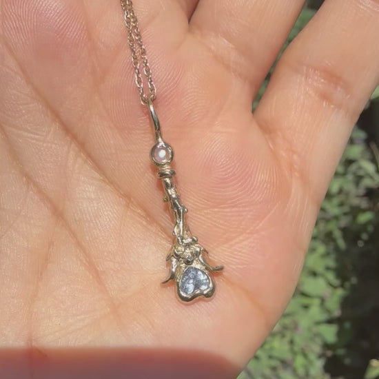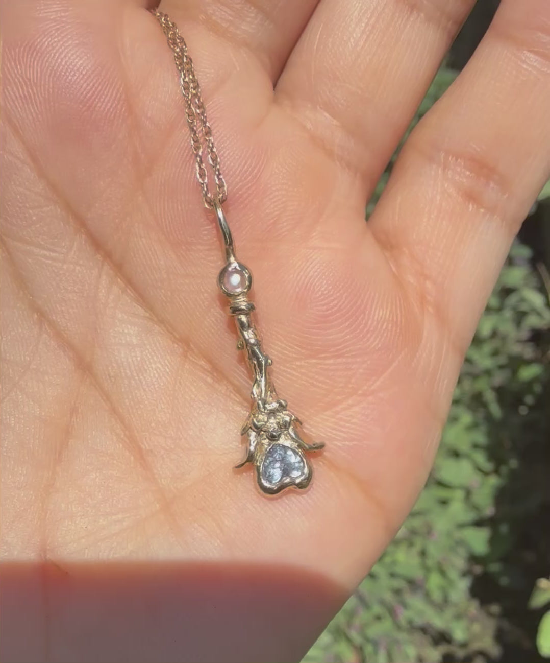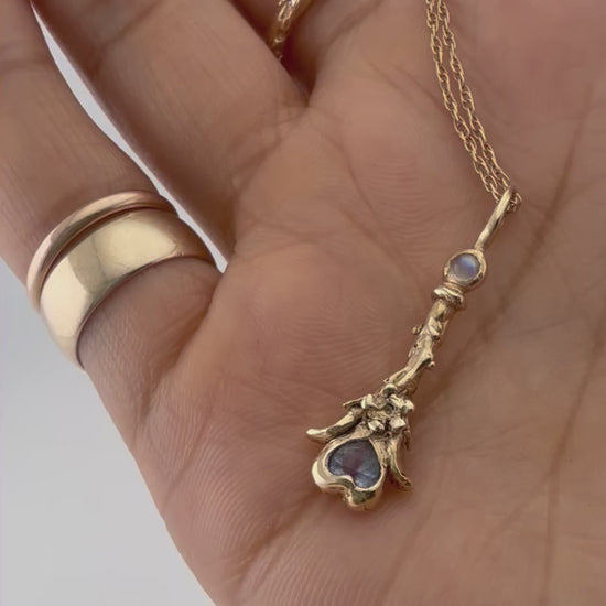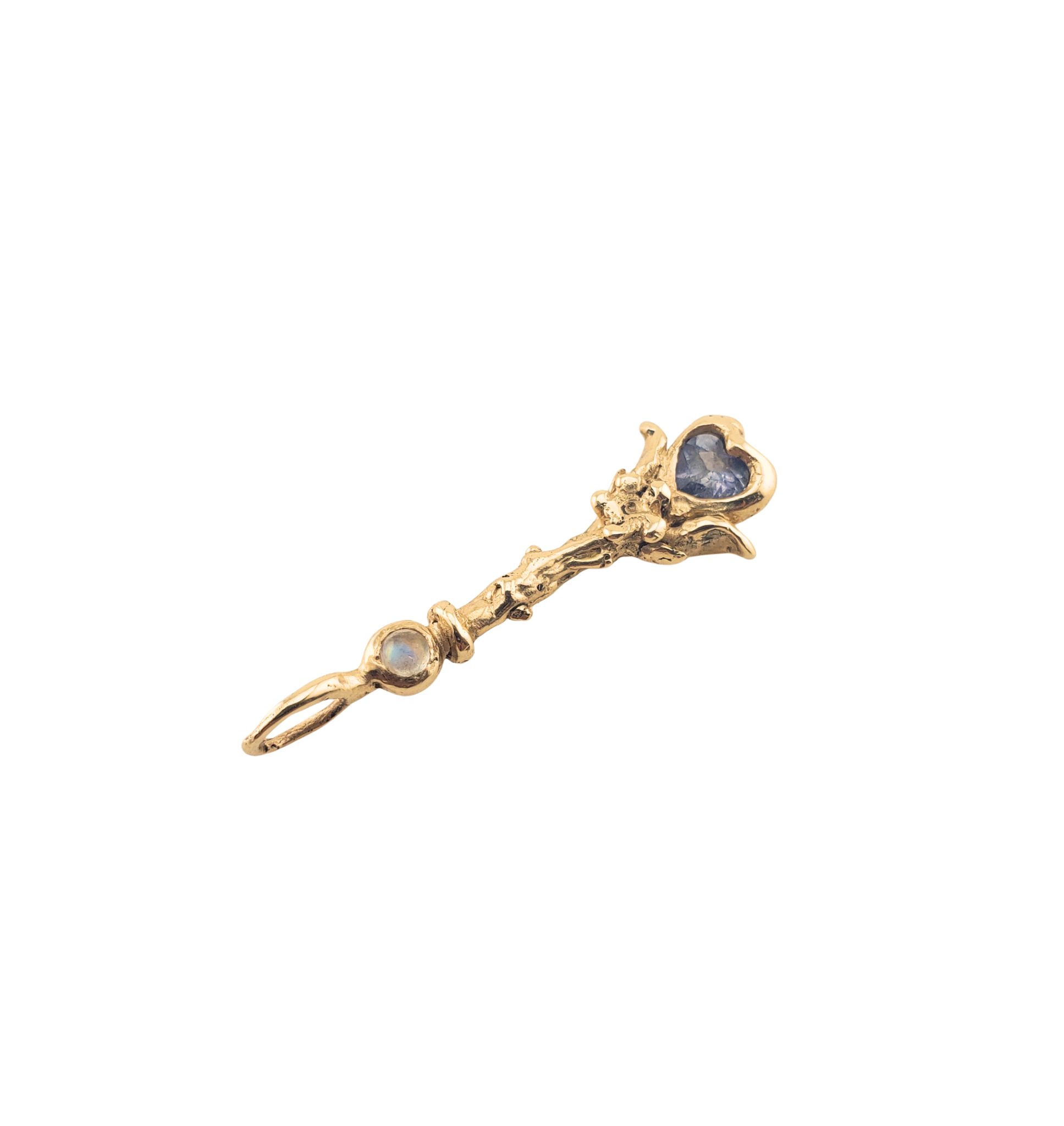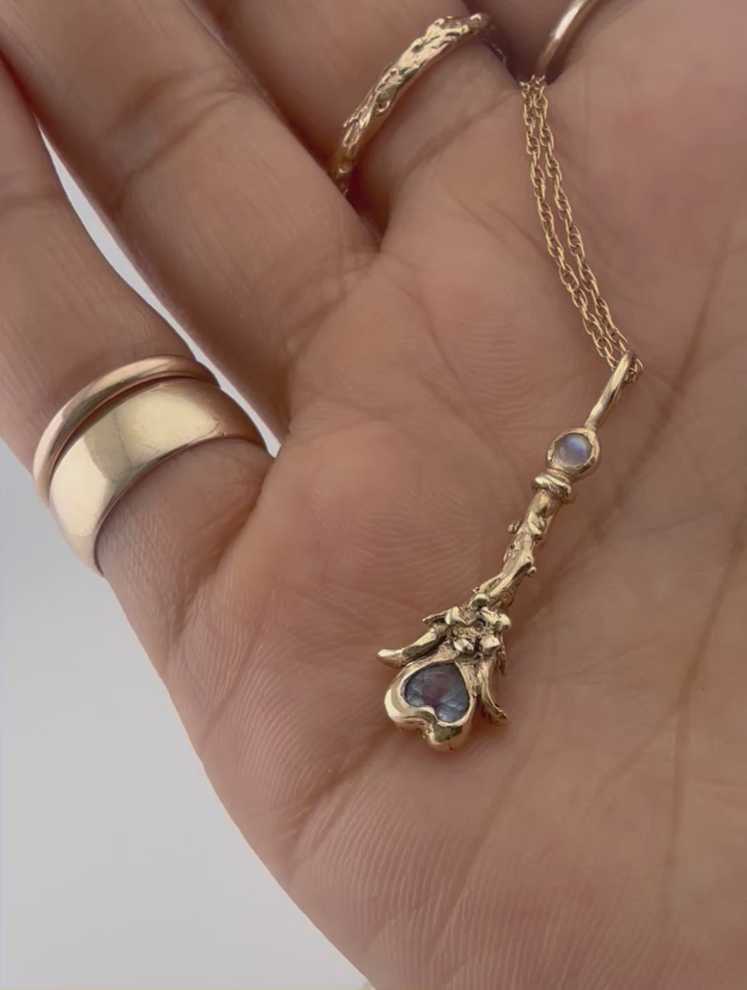 This OOAK pendant is a delicate whisper of magic. This gold fairy flower wand seems plucked from the edge of a dream. Its slender stem blossoms into intricately hand carved petals. At its heart rests a sapphire, shaped like a tender heart, glowing with the quiet fire of twilight skies. Nestled on the bottom is a moonstone. It shimmers with pearlescent light, like moonbeams caught in morning dew.