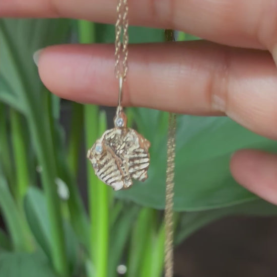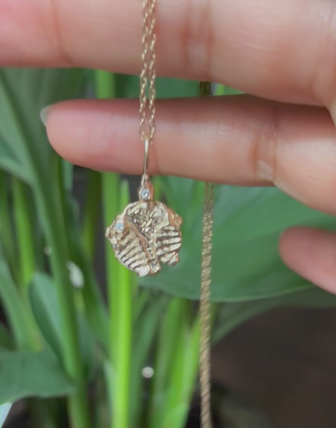 Forged from the whispers of ancient tides, this one of a kind pendant, inspired by a Spanish piece of eight coin, glimmers in solid gold. Adorned with delicate shell accents and three tiny diamonds, it echoes the allure of sunken treasures lost to time.